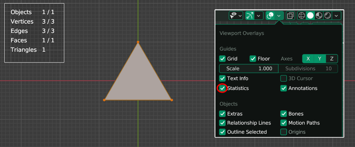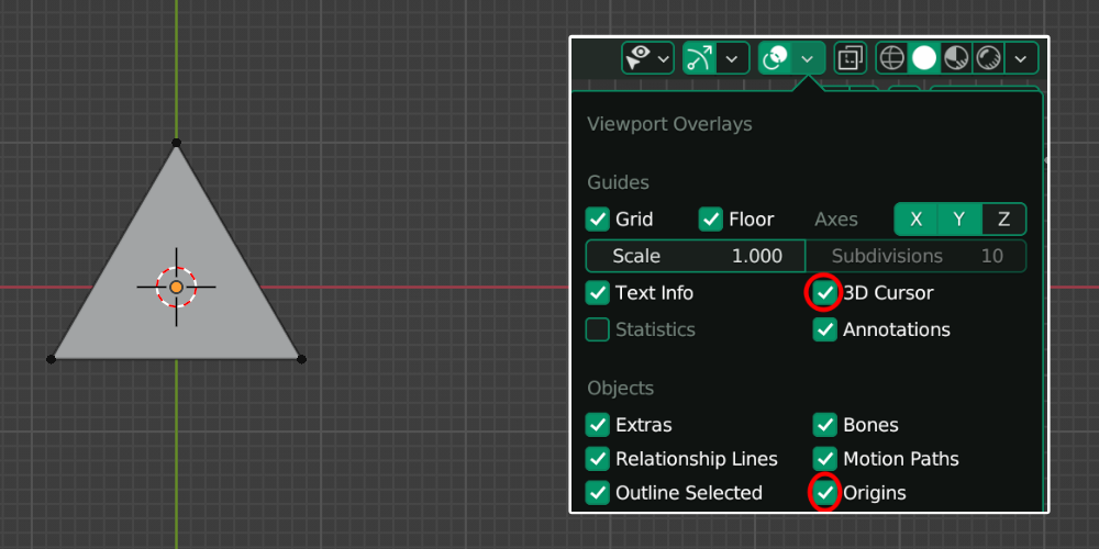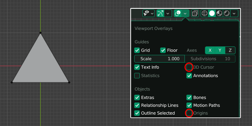 빨간색 점선으로 이루어진 원은 [3D Cursor]이고 3차원 공간에서의 커서이며 모든 객체의 생성은 이곳을 기준으로 생성이 됩니다. 주황색 점은 [Origin]이라고 하며 현재 객체의 기준점(중심점이 아님)이며 이 객체에 포함된 모든 요소들의 좌표는 이 [Origin]을 기준으로 표시가 됩니다. 설명을 위해 이 아이들을 안 보이도록 설정하겠습니다.