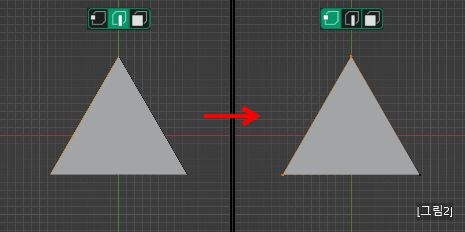 [그림 2] 마찬가지로 <2>에서 선을 하나 선택하고 <1>로 전환을 하면 관계된 점 2개를 선택하는 효과가 있습니다.