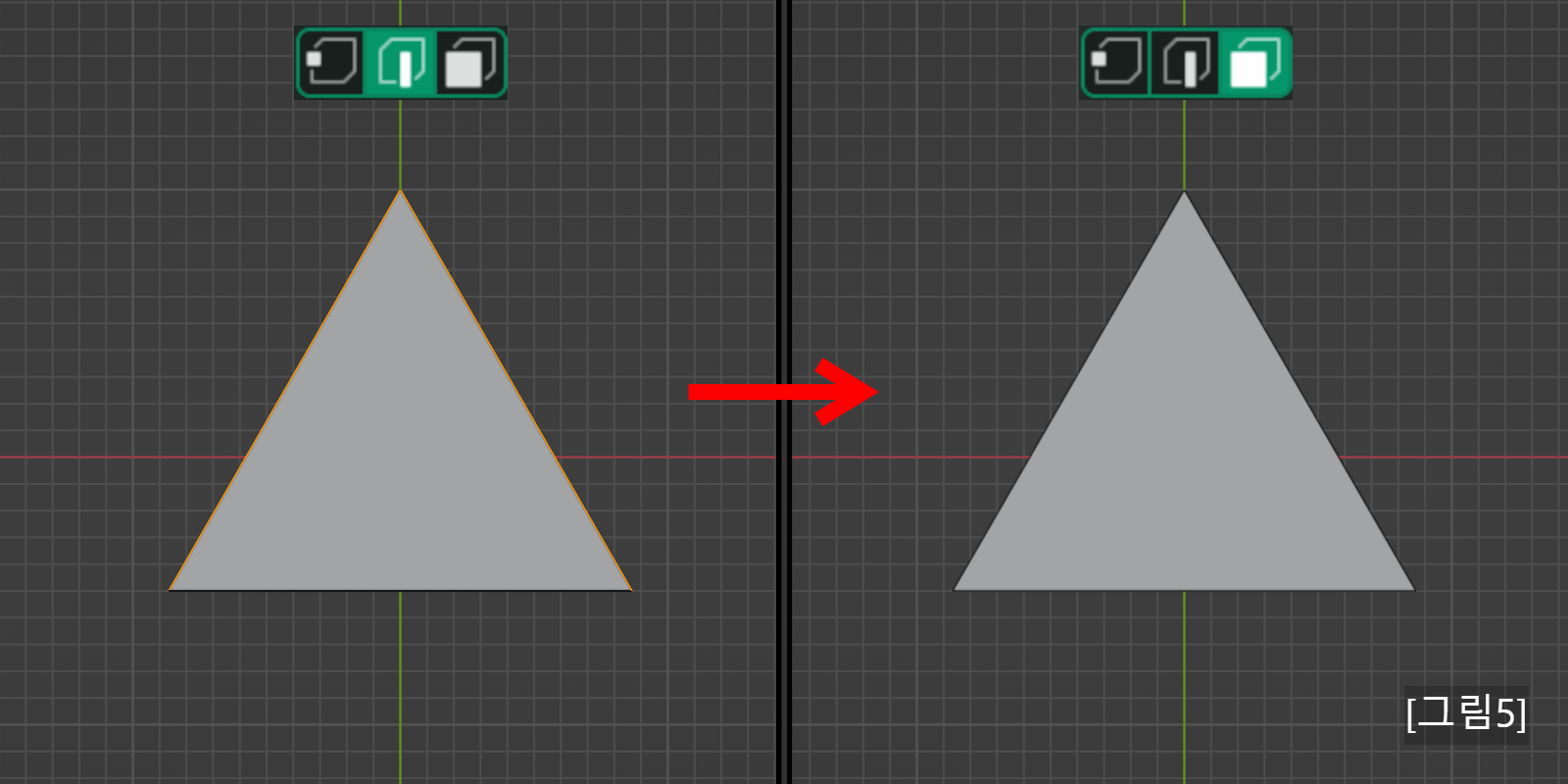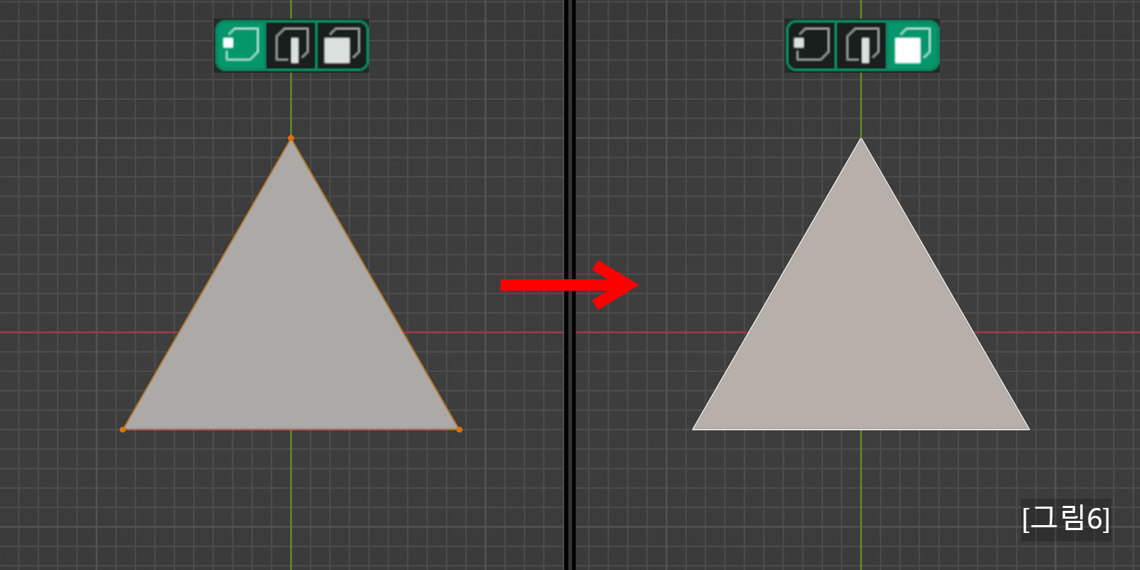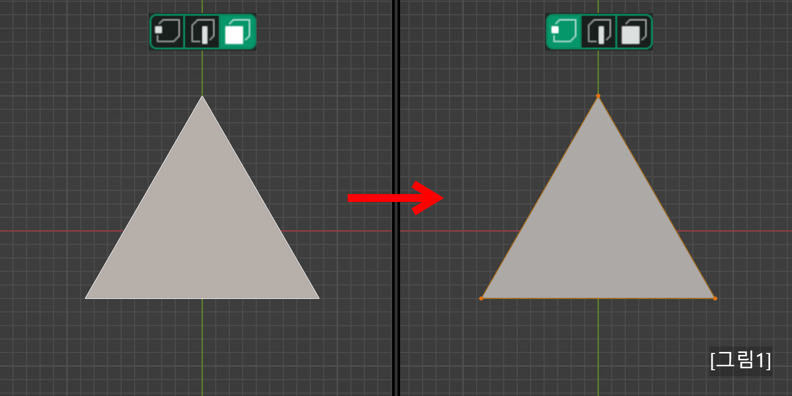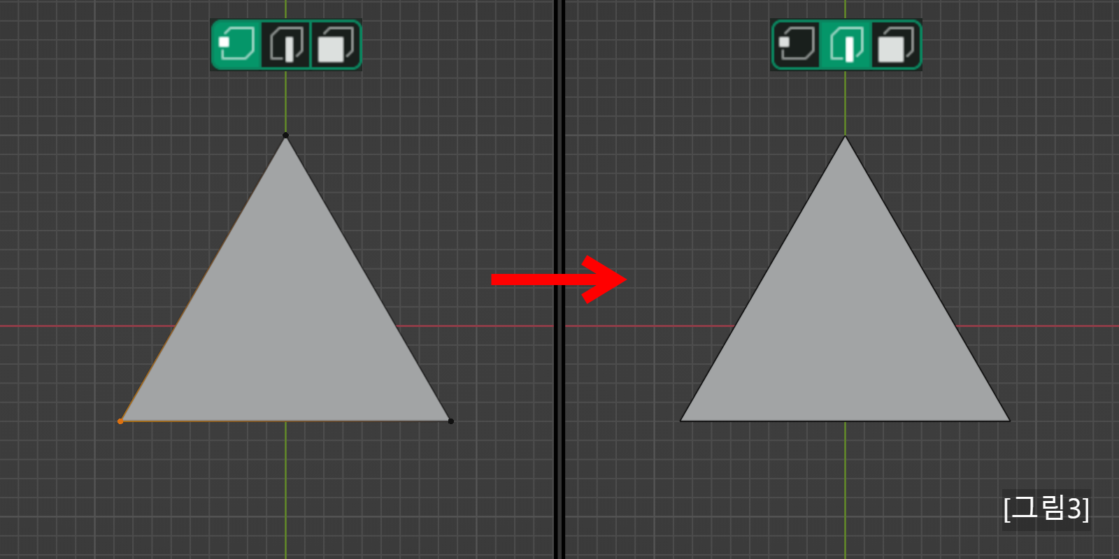 [그림 6] <1>에서 점 3개를 선택하고 <3>으로 전환을 하면 면 1개가 선택되었습니다.