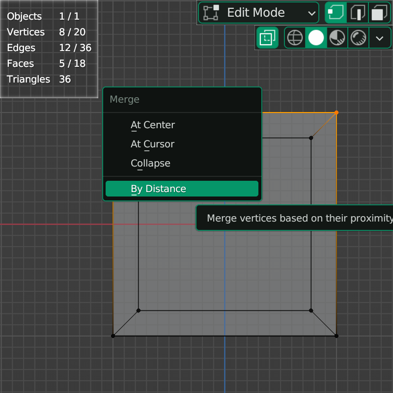 <Alt>+<Z>를 눌러 [X-Ray] 켜고 중복되었다고 생각되는 점들을 선택합니다. <M>을 클릭하고 [By Distance]를 선택하면 화면 중앙 맨 아래에 [Removed ... vertices]라는 메시지와 함께 중복된 점이 사라지는 것을 확인할 수 있습니다. [By Distance]는 0에 가까운 거리에 있는 요소들끼리 합치라는 의미입니다.