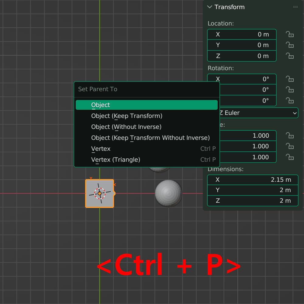 일반적으로 큐브를 선택해서 움직일 것이기 때문에 큐브가 부모가 되고 [Empty]가 자식이 될 것입니다. 그래서 2개의 객체를 같이 선택하고 <Shift>를 누른 상태로 큐브를 다시 선택해 줍니다. 그러면 큐브는 활성화 객체가 됩니다. 다시 <Ctrl+P>를 누르면 [Set Parent To] 메뉴가 뜨는데 [Object]를 선택해 줍니다. 객체를 왼쪽으로 이동해 보았습니다.