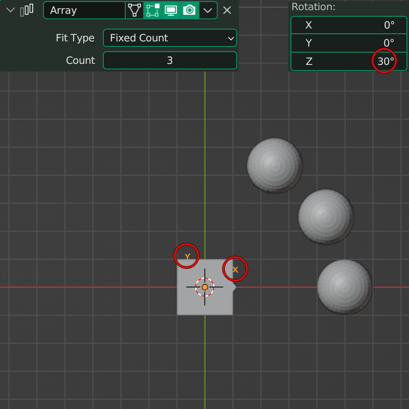 [Array]설정을 하지 않은 상태에서 [Z]축에 30을 입력 했다고 가정해 보세요. 원점을 기준으로 30만큼 이동하는 것이 당연합니다. 그래서 스퀘어가 반시계로 30도만큼 이동한 다음 [Array]에 의해 시계방향으로 다시 30도 위치에 나타난 것입니다.