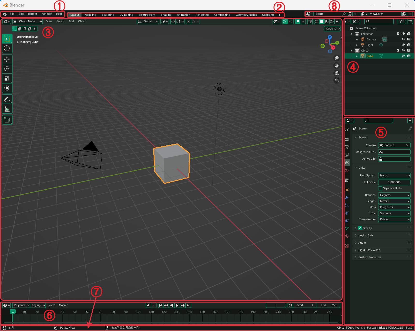처음 블렌더를 실행하면 [Layout] 작업환경이 설정되어 있습니다.